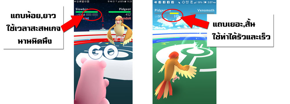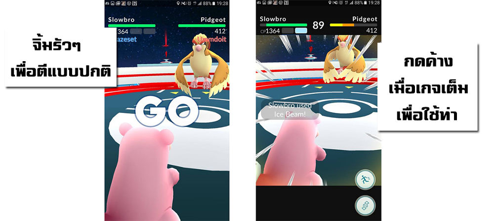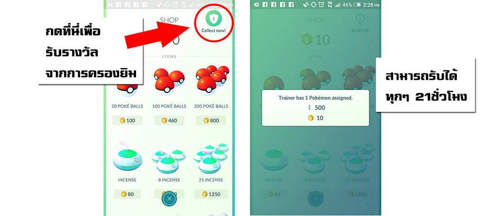 **ทริคถ้าเข้ายึดยิมได้แล้ว ให้รีบตียิมของตัวเองให้เลเวลอัพ เพื่อที่คนอื่น(สีเดียวกัน) จะสามารถเอาตัวมาช่วยป้องกันยิมได้ค่าสามัคคีคือพลัง! ถ้าเจอยิมไหนโหดๆ อย่าไปกลัว ชวนเพื่อนๆ พ่อแม่พี่น้องมา ช่วยกันรุม แปปเดียวก็บึ้มม เกิดเป็นโกโก้ครั้นช์!! หรือจะช่วยกันอัพเวลยิมของตัวเองให้สูงๆ ก็ได้นะ ซึ่งถ้ามีคนกำลังตียิมด้วยกันกับเราอยู่ จะขึ้นไอคอนหน้าคนกับตัวเลขบอกจำนวนคนที่ตีอยู่ขึ้นมา♦ กดที่ตัวโปเกม่อนรัวๆ เพื่อโจมตีแบบธรรมดา♦ สไลด์ซ้าย-ขวา เพื่อหลบการโจมตี♦ กดค้างที่ตัวโปเกม่อน เพื่อใช้ท่าไม้ตาย► ท่าของโปเกม่อน ( Move )ท่าของโปเกม่อนสามารถดูได้ด้านล่างของข้อมูลโปเกม่อน ทุกตัวจะมี 2 ท่า ท่าด้านบนคือท่าธรรมดา และท่าล่างคือท่าไม้ตายนั่นเองการที่จะใช้ท่าไม้ตาย เพื่อนๆ จะต้องสะสมเกจจากการต่อสู้ซะก่อน สามารถดูได้จากมุมซ้ายบน ด้านล่างของ HP ซึ่งเกจนี้จะขึ้นอยู่กับท่าของโปเกม่อน โดยเกจจะเพิ่มได้จากการโจมตี หรือถูกโจมตี (ถ้าโจมตีจะขึ้นเร็วกว่ามาก) ท่าไม้ตายของแต่ละตัวจะไม่เหมือนกันนะ ความแตกต่าง ดังนี้ค่า♦ เกจแบบยาว เกจสีฟ้ายาวๆ ก็คือ ต้องสะสมเกจให้เต็มทั้งหลอดถึงจะใช้ได้ ใช้เวลาสะสมเกจนานหน่อย แต่ส่วนใหญ่แล้วท่าจะแรง♦ เกจแบบสั้น เกจหลอดเล็กๆ หลายๆ หลอด หมายความว่า ถ้าเกจเต็ม 1 หลอดก็สามารถใช้ได้เลย 1 ครั้ง ทำให้สามารถใช้ท่าได้ถี่ และเร็ว► ยึดยิมได้แล้ว รับรางวัลยังไง?การรับรางวัล สามารถรับที่ไหนก็ได้ ไม่ต้องไปรับที่ยิม ให้เข้าไปที่ Shop ดูที่มุมขวา จะมีไอคอนรูปโล่อยู่ ตัวเลขที่อยู่บนโล่จะบอกจำนวนยิมที่เรายึดอยู่ (ยึดได้สูงสุด 10 ยิม) เมื่อกดที่โล่แล้วก็จะได้รางวัลเป็น 10 Pokecoins และ 500 Stardust ต่อ 1 ยิมที่เรายึดอยู่ สามารถกดรับได้ทุกๆ 21 ชั่วโมง ก็คือ ถ้าหากกดรับเหรียญไปแล้ว จะต้องรอ 21 ชั่วโมงเพื่อกดรับเหรียญอีกครั้ง ถึงจะยึดยิมใหม่แล้วก็ยังกดไม่ได้จนกว่าจะครบเวลส ดังนั้นควรวางแผนให้ดีๆ ก่อนที่จะกดรับ เช่น วันนี้จะไปตียิมไหนอีกมั้ย มียิมไหนใกล้ๆ อีกหรือเปล่า ถ้าไม่มีแผนจะตียิมไหนแล้วก็กดรับไปได้เลย♦ เมื่อยึดแล้ว หากยิมถูกตีแตก หรือ XP ยิมลดจนตัวเราเด้งออกมา จะไม่สามารถรับเหรียญได้ มันจะนับแค่โปเกม่อนที่ยังยืนอยู่ในยิมเท่านั้นจบไปแล้วว น้องแมวก็หวังว่าบทความนี้จะเป็นประโยชน์กับเพื่อนๆ ชาวโปเกม่อนเทรนเนอร์ทุกคนนะคะ แล้วพบกันใหม่กับไกด์เกมหน้า และอย่าลืมติดตามข่าวสารเกมมือถือและไกด์เกมอื่นๆ กับ Mustplay ด้วยนะ! วันนี้ขอหนีไปจับโปเกม่อนต่อล่ะ อิอิ สวัสดีค่า~♥ มาเข้ากลุ่มรวมพลเหล่าเทรนเนอร์ได้ที่นี่