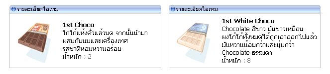 - แก้ไขชื่อไอเทม Chocolate และ White Chocolate จากกิจกรรมตามหาส่วนผสมเค้ก เป็น " 1st Choco และ 1st White Choco "