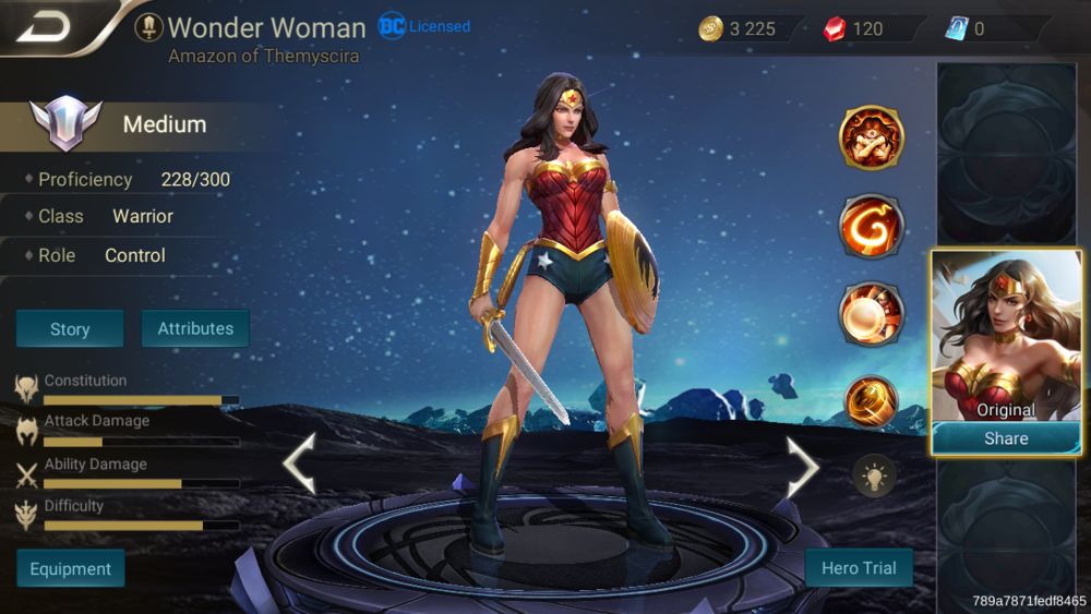 - Wonder Woman ตวัดแส้ ใส่ศัตรู เมื่อศัตรูมีเลือดมากกว่า 50% Wonder Woman จะดึงตัวเองเข้าไปหาเป้าหมาย ทำดาเมจ 250 (+168 ดาเมจกายภาพ)