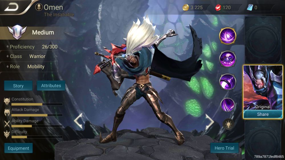 - เพิ่มเติม : Omen มีโอกาสที่จะโจมตีเบิ้ล 2 ครั้ง เมื่อทำการโจมตีปกติ โดยที่ การตีครั้งที่ 2 ของเขาจะทำดาเมจเพียง 50 % เท่านั้น