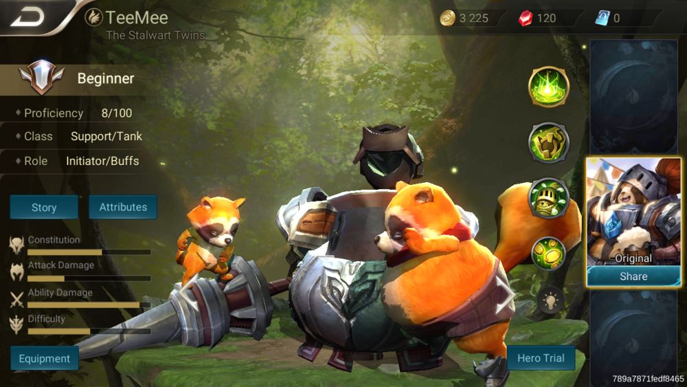 - เมื่อมีครีปศัตรูตายใกล้ TeeMee สองพี่น้องแรคคูนอ้วนจะรีบไปเก็บเศษซากมา ทำให้เพื่อนร่วมทีมที่อยู่ใกล้ๆ ได้รับทองมากขึ้น 25 %