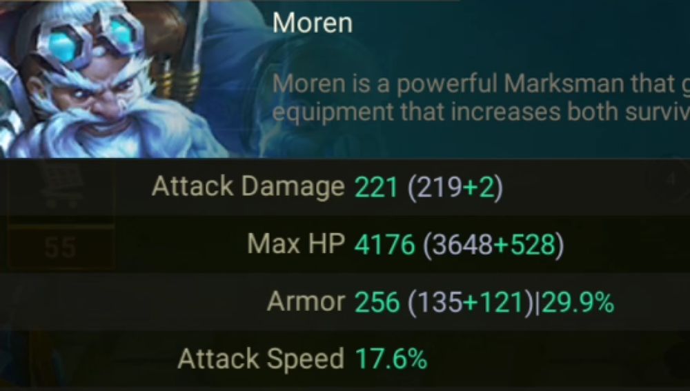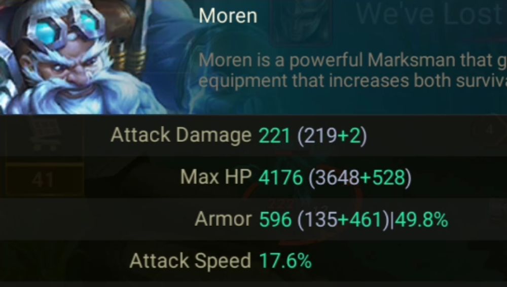 - นอกจากนี้ ลุง Moren จะได้รับบัฟ 25 เกราะและ ต้านเวท เป็นเวลา 5 วินาที ซึ่งการได้บัฟนี้มา จะถูกยืดเวลาออกไปยาวนานขึ้นเมื่อทำการยิงด้วยสกิลนี้ ซ้ำๆ โดยสามารถ ซ้อนทับได้สูงสุด 10 ครั้ง เท่ากับว่า เกราะและต้านเวท จะเพิ่มขึ้นได้ถึง 250 หน่วย เมื่อยิงสกิล ต่อเนื่องเรื่อยๆ 10 ครั้ง