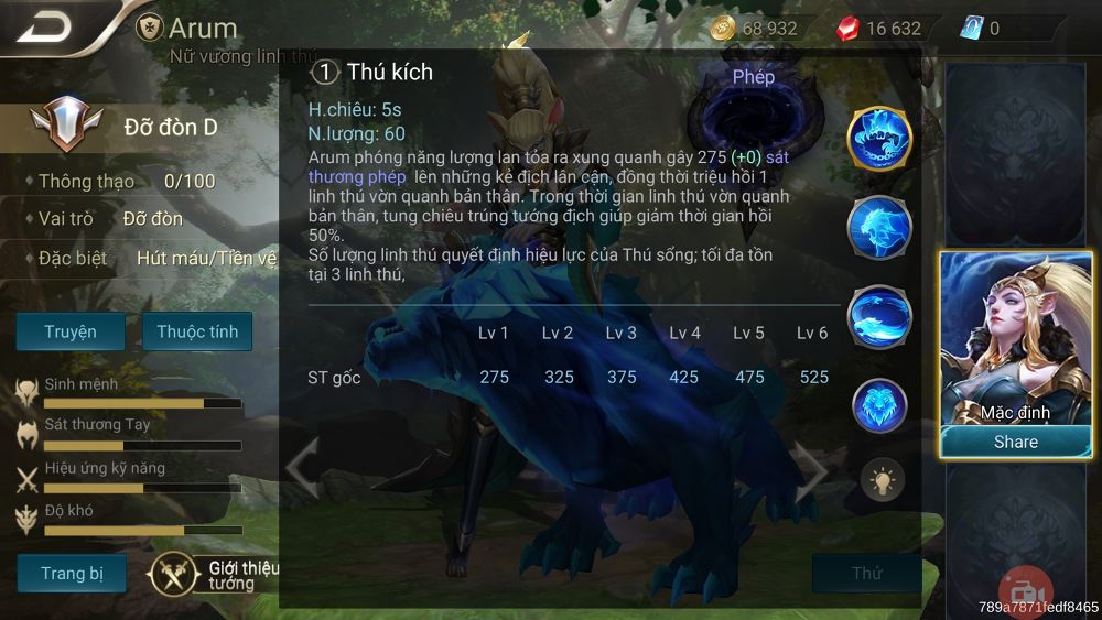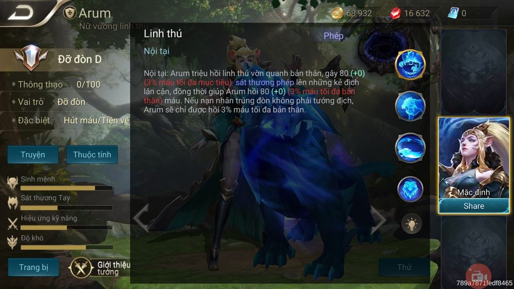 - (ใหม่) ทุกครั้งที่เธอใช้สกิล 1 หรือ 2 โดนศัตรู จะได้รับการฟื้นฟูเลือด 9% เป็นเวลา 3 วินาที