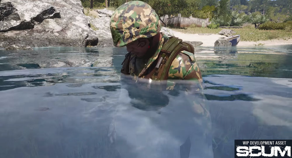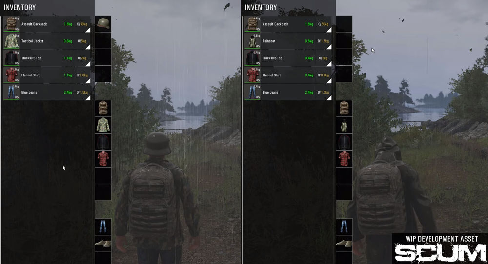 SCUM เป็นเกมแนว Open World Survival แบบ Multiplayer หากนึกภาพไม่ออกก็ลองนึกถึก War Z เข้าไว้ เพียงแต่จากภาพและคลิปที่ถูกปล่อยออกมา SCUM จะมีกราฟิกของเกมและระบบการเล่นที่โดดเด่นยิ่งกว่าเกมไหนๆและในคลิปตัวล่าสุดที่พวกเขาปล่อยออกมาก็เผยให้เห็นถึงระบบความชื้นและความแห้งของอากาศ ซึ่งตัวละครจะได้รับผลกระทบทั้งจากน้ำฝนและน้ำทะเล พวกเขาบอกว่าบางเกมนั้นผู้เล่นสามารถอยู่รอดได้ในอากาศที่หนาวเย็น แถมตัวยังเปียกฝนซะอีกซึง่นั่นมันไม่จริงเอาเสียเลย และที่น่าสนใจยิ่งกว่านั้น คือเกมนี้เสื้อผ้าเครื่องแต่งกายของผู้เล่นจะมีน้ำหนักที่แตกต่างกัน รวมไปถึงระดับการดูดซับน้ำที่แตกต่างกันด้วย รวมไปถึงผู้เล่นสามารถจัดการให้เสื้อผ้าตัวละครที่เปียกกลับมาแห้งได้อีกครั้ง ยกตัวอย่างเช่นการเดินออกไปตากแดดหรือรับลม (สมจริงโคตรๆ)ภาพนี้แสดงให้เห็นว่าตัวละครที่ใส่เสือกันฝนกับไม่ใส่ ตัวเสื้อจะมีการอุ้มน้ำที่น้ำหนักต่างกันด้วยการลงไปเดินในน้ำจะทำให้เสื้อผ้าดูดซับน้ำ และส่งผลต่อตัวละครเราโดยตรงเห็นแบบนี้แล้วใครที่เป็นสาย Hardcore Survival น่าจะอยากเล่นกันไม่ใช่น้อยเลยทีเดียว สำหรับ SCUM นั้นตัวเกมมีกำหนดจะวางจำหน่ายตัวเกมในแบบ Early Access ภายในช่วงไตรมาสแรกของปี 2018 นี้