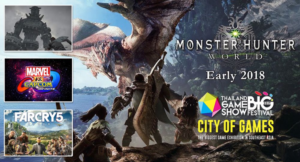 HIGHLIGHT หลักประจำงานเลยคือ MONSTER HUNTER WORLD !! สุดยอดเกมที่ผู้เล่นทั่วโลกตั้งหน้าตั้งตารอคอยกันอยู่ โดยจะเปิดให้ทดสอบช่วงเบต้าบนเครื่อง PlayStation 4 วันที่ 9 ธันวาคมนี้ แต่.. คนที่ไปร่วมงานนี้จะได้ทดลองเล่นกันก่อนเลยภายในงาน ในบูธของ SONY เท่านั้น ฉะนั้นห้ามพลาดด้วยประการทั้งปวงเลยครับ!เกมที่ได้รับการแปลเป็นภาษาไทย1. Shadow of the Colossus (แปลไทย)สุดยอดเกมในตำนานบนเครื่อง PS2 ที่กลับมา Remake ใหม่อีกครั้งบนเครื่อง PS4 ซึ่งเคยได้รับการยกย่องว่าเป็นเกมอมตะตลอดกาลเกมหนึ่งของวงการเกมเลยทีเดียว โดยการกลับมาคราวนี้ได้ Bluepoint Studio มาดูแลการผลิตด้วย ที่สำคัญยังได้รับการยืนยันแล้วด้วยว่าเกมนี้จะได้รับการแปลเป็นภาษาไทยให้เกมเมอร์ชาวไทยได้เล่นกันด้วยนะ2. Gran Turismo Sport (แปลไทย)ว่ากันว่านี่คือเกมแข่งรถที่ดีที่สุดประจำปีนี้ กับ Gran Turismo เกมแข่งรถสุดเรียลที่มีความสมจริงในด้านการบังคับควบคุม โดยสามารถปรับแต่งรถยนต์ได้หลากหลาย สามารถเลือกสนามแข่ง เลือกรถ โดยแข่งแบบจบเป็นรอบๆไป ภาคนี้ตัวเกมกลับมาพร้อมกับยี่ห้อรถมากมาย ความสมจริงขั้นสุด และที่สำคัญ ภาษาไทย!3. Secret of Mana (แปลไทย)เกมแนว JRPG ที่มีสไตล์และรูปแบบคล้ายๆ Final Fantasy เรื่องราวของเหล่าเด็กที่ออกผจญภัยเพื่อตามหาสมบัติ แต่แล้วก็ค้นพบต้นไม้ศักดิ์สิทธิ์ต้นหนึ่ง ซึ่งรอบนี้กลับมาลง PS4 พร้อมกับการรีเมคให้มาเป็นรูปแบบ 3D และแน่นอน ภาษาไทยด้วยจ้า4. Marvel VS. Capcom : Infinite (แปลไทย)สุดยอดเกมไฟท์ติ้งที่นำเอาฮีโร่และตัวละครเด่นจากสองค่ายเกมมาปะทะนั่นคือค่าย Marvel และ Capcom นั่นเอง ซึ่งมากันทั้ง Ironman , Hawkeye , Megaman , Thanos เรียกได้ว่าเป็นเกมไฟท์ติ้งที่นำเอาตัวละครเท่ๆจากทั้งสองค่ายมารวมตัวกันไว้อย่างมาก เกมนี้วางจำหน่ายได้เดือนนึงแล้ว มีภาษาไทยเต็มรูปแบบด้วย อย่าพลาดมาลองเล่นกันในงานนะครับเกมที่นำไปจัดแสดงเพิ่มเติมเกมแนว Open World ชื่อดังของ Ubisoft ที่ดำเนินเรื่องราวมาถึงภาค 5 แล้ว โดยภาคนี้เราจะต้องต่อสู้กับพวกคลั่งศาสนาในเมืองชนบทเล็กๆแห่งหนึ่งในชายขอบดินแดนประเทศสหรัฐอเมริกา ภาคนี้บอกเลยว่า ทั้งกราฟิค ทัศนียภาพ วิวทิวทัศน์ภายในเกม ที่ดูสวยงามอย่างยิ่ง แฟนๆ Far Cry ที่ติดตามกันมาตั้งแต่ภาคแรกอย่าพลาดไปทดลองเล่นภายในงานนี้เกมแนวแอ็คชั่นมุโซวเดินหน้าฟันแหลกที่อยู่คู่วงการเกมมาเนิ่นนานตั้งแต่ยุค PS2 เดินเรื่องราวมาจนถึงภาค 9 พร้อมกับปรับเปลี่ยนตัวเกมให้ผสมผสานกับแนว Open World เข้าไปอีก คอเกมแอ็คชั่นต้องห้ามพลาด ไปลองกันในงานเลยจ้าเกมฟุตบอลยอดนิยมที่ภาคนี้ได้อัพเดทนักเตะใหม่ให้เท่าทันกับฤดูกาลปัจจุบัน และยังพัฒนาระบบการเล่น ที่ปรับเปลี่ยนการแย่ง และ