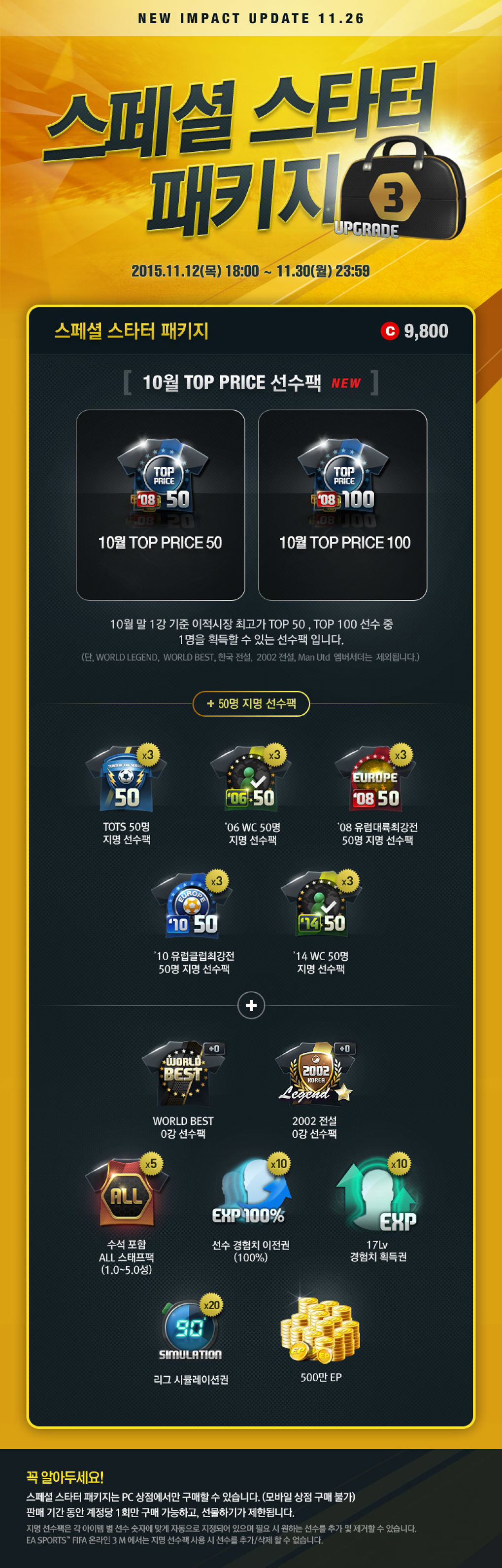เนื่องจากทาง FIFA ONLINE 3 ได้มีแผนการอัพเดท NEW IMPACT ใหม่จึงได้เปิดขาย SPECIAL STARTER PACKAGE ใน ราคา 9,800 coins โดยแพคเกจพิเศษนี้จะประกอบไปด้วย TOP PRICE package ต่างๆของเดือนตุลาคม ดังนี้