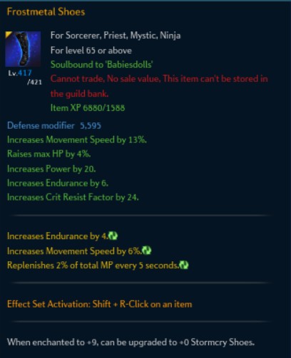 รองเท้า : แบ่งออกเป็น 3 ประเภทเช่นกัน รองเท้านั้นจะเพิ่มพลังป้องกัน เน้นไปที่ความเร็วในการเคลื่อนที่ เพิ่ม Max HP สูงสุด ค่าการป้องกันคริติคอล ส่วนออพชั่นจะเน้นไปที่เพิ่มความเร็วการเคลื่อนที่เป็นส่วนใหญ่