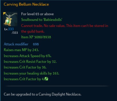 สร้อยคอ : มีให้เลือก 2 แบบ เช่นเดียวกัน เน้นเพิ่มพลังโจมตี Max MP ความเร็วการโจมตี ค่าการป้องกันคริติคอล ออพชั่นจะมีให้เลือกใช้หลายแบบเช่น พลังโจมตี คริติคอล ความถึก เลือกใช้ตามความเหมาะสมครับ