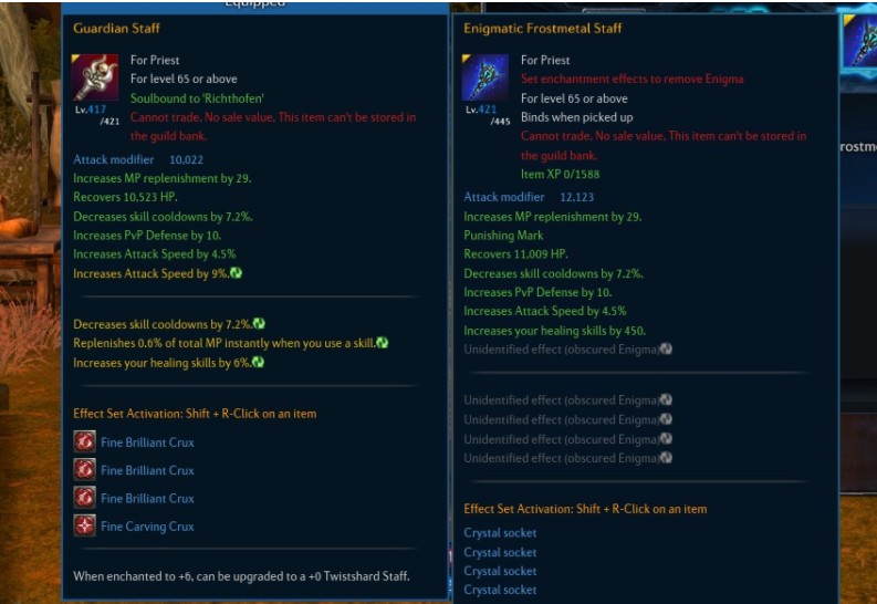 โดยอุปกรณ์ทั้งหมดนี้ จะมีระดับความสามารถแตกต่างกันไปขึ้นอยู่ที่คลาสอาชีพที่ใส่ด้วย ซึ่งไอเทมเลเวลระดับต้นจนถึงระดับกลาง จะไม่ได้มีออพชั่นให้เลือกมากนัก จะมาจัดออพชั่นกันจริงจัง คือตอนเลเวล 65 เพราะยิ่งเราอัพเกรดไอเทมขึ้นระดับสูงมากแค่ไหน จะมีออพชั่นให้ใส่เพิ่มขึ้นด้วย เช่น เซ็ตการ์เดี้ยนเลือกออพชั่นใส่ได้ 3 ส่วน แต่เซ็ตฟรอสเมทัล สามารถใส่ได้ 4 ส่วน นั้นเอง ดูได้จากภาพด้านบนครับ