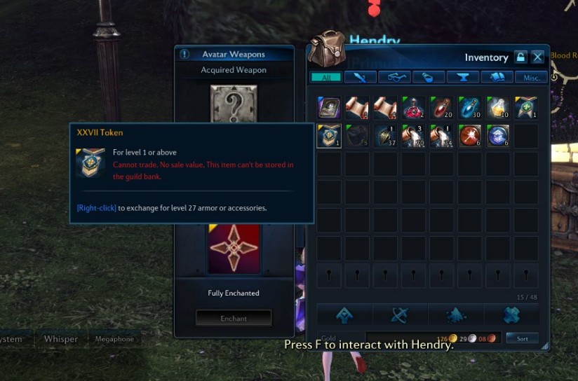 อาวุธ : เป็นไอเทมหลักในการโจมตี โดยจะมีค่าพลังโจมตีเป็นตัวนำ เลเวลที่สามารถใส่ได้ ออพชั่นประจำอาวุธ และออพชั่นพิเศษ โดยส่วนใหญ่ออพชั่นของอาวุธนั้นจะเน้นไปการโจมตีต่าง ๆ เช่น ตีข้างหน้าแรงขึ้น ตีด้านหลังแรงขึ้น ลดสกิลคูลดาวน์ เพิ่มคริติคอล เป็นต้น