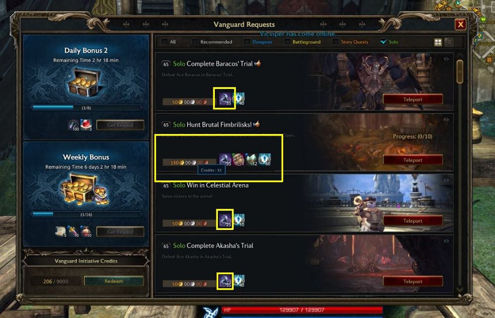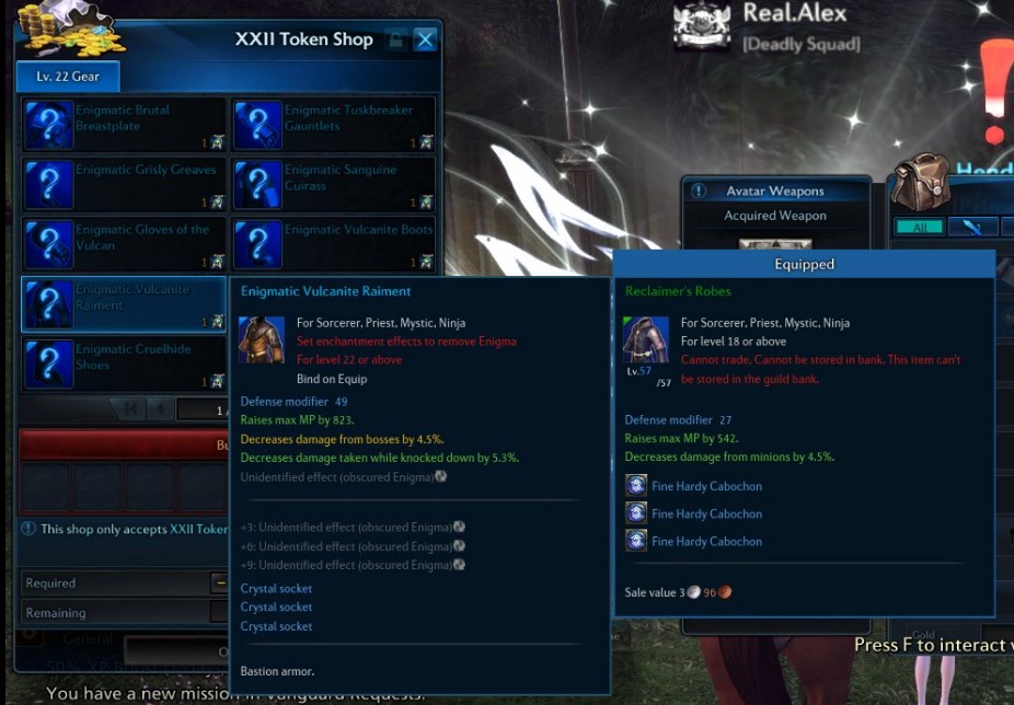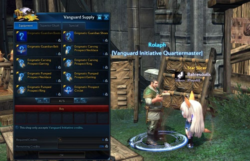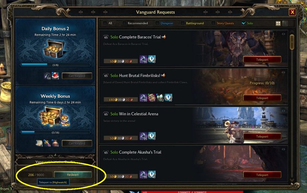 ลองกดตัว H ขึ้นมาครับ จะเป็นหน้าต่าง Vanguard Requests ซึ่งจะมีรายชื่อเควสที่ขึ้นมาให้เราสามารถรับเควสไปทำภารกิจต่าง ๆ ได้ เมื่อทำเควสเสร็จะได้รับไอเทมจำนวนหนึ่ง เช่น เงิน แร่ต่าง ๆ และ Vanguard Credits ซึ่งแต้มนี้แหละครับ เราจะเอาไปแลกไอเทมสวมใส่ระดับ 65 ได้ ซึ่งจะแลกกได้เฉพาะเซ็ตการ์เดี้ยนเช่นกัน ซึ่งจะสามารถแลกได้ทั้งหมด 12 ชิ้น ที่แลกไม่ได้คือ ชุดชั้นในหรือ Inner ชิ้นเดียวนั้นเอง โดยให้เราวาร์ปไปที่เมือง ทำตามภาพด้านล่างเลย จะไปโผล่ตรง NPC ที่ขายของครับ