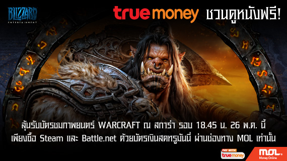 กิจกรรมดีๆ สำหรับผู้ที่เติมเงินด้วยบัตร Truemoney เข้าที่เว็บไซด์ th.mol.com, www.easyblizzard.com และ www.easysteam.in.th ในราคาบัตรที่เติมตั้งแต่ 150 บาท ขึ้นไป สามารถลุ้นรับบัตรชมภาพยนตร์เรื่อง Warcraft ในวันที่ 26 พ.ค. 59 ที่โรงภาพยนตร์ สการ่า รอบเวลา 18:45 น.จำนวน 1 รางวัลๆละ 2 ที่นั่ง (รวม 200 ที่นั่ง) ได้แล้วตั้งแต่ 16 - 22 พฤษภาคม 2559 นี้เท่านั้น