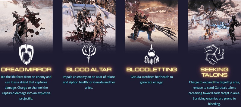 ขอเชิญพบกับ Warframe ชุดใหม่ที่มีนามว่า Garuda โดยมีสกิลทักษะที่มากความสามารถอยู่ไม่น้อยเลยล่ะคะ โดยแบ่งสกิลออกเป็นดังต่อไปนี้● Dread Mirror : เป็นสกิลที่ดูดพลังงานชีวิตของศัตรู แถมนำมาสร้างเป็นเกราะป้องกันได้ชั่วขณะ เมื่อเราทำการชาร์จไว้สักระยะ เราขว้างก้อนพลังงานแล้วระเบิดใส่ศัตรูได้ทันที● Blood Altar : เป็นการแทงศัตรูในคราวเดียว จากนั้นทำการสูบฉีดพลังชีวิต [HP] มาเพิ่มค่าพลังชีวิตให้แก่ Garuda และพวกพ้องของเรา● Bloodletting : ยอมเสียค่าพลังชีวิต [HP] ส่วนหนึ่งมาเพิ่มค่าพลังงาน [MP]● Seeking Talons : ปล่อยเพลิงไฟออกมาแผดเผาศัตรูจนกว่าจะวอดวายไม่เหลือซาก ซึ่งรัศมีการโจมตีจะแผ่เป็นวงกว่างโดยรอบ แถมส่งผลให้ศัตรูนอนคว่ำไปมาอีกด้วยคลิิปวิดีโอดูในช่วง 18:05 - 30:00 นะ