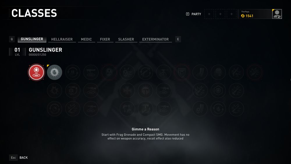 - Lv.25 : Executioner : ฆ่าซอมบี้ 15 ตัวติดกันอย่างรวดเร็ว จะมีโอกาส 25% ที่จะเติมอุปกรณ์ (ระเบิดมือ) ให้