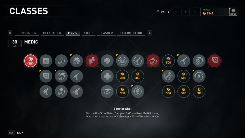 - Lv.22 : Desperado : ปืนพกหรือปืนสั้น (น่าจะหมายถึงอาวุธรองทั้งหมด) ทำดาเมจได้มากขึ้นอีก 25%
