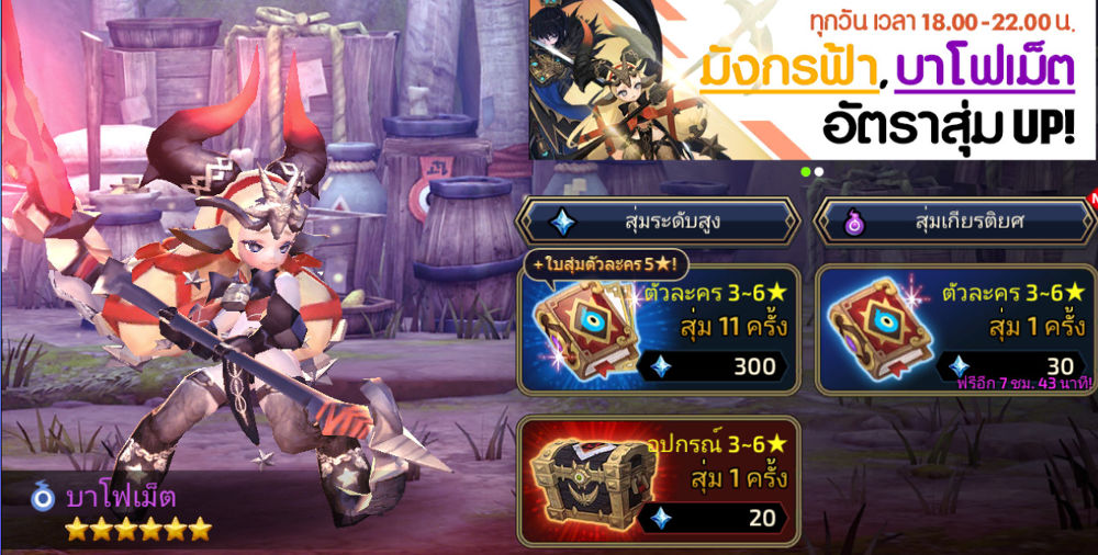 - เพิ่มอัตราการดรอปตัวละครสุดพิเศษทั้งนักล่าและโยไก ใน “กิจกรรมฮ็อตไทม์สุ่มตัวละคร” ผู้เล่นจะมีโอกาสสุ่มเจอตัวละครเด็ด ๆ อย่างมังกรฟ้าระดับตำนาน และบาโฟเม็ตระดับอัศวิน เพิ่มขึ้นอีกด้วย เฉพาะเวลา 18.00- 22.00 น.เท่านั้นนะ!! อย่าไปสุ่มผิดเวลาเสียผลึกดาวฟรีล่ะ