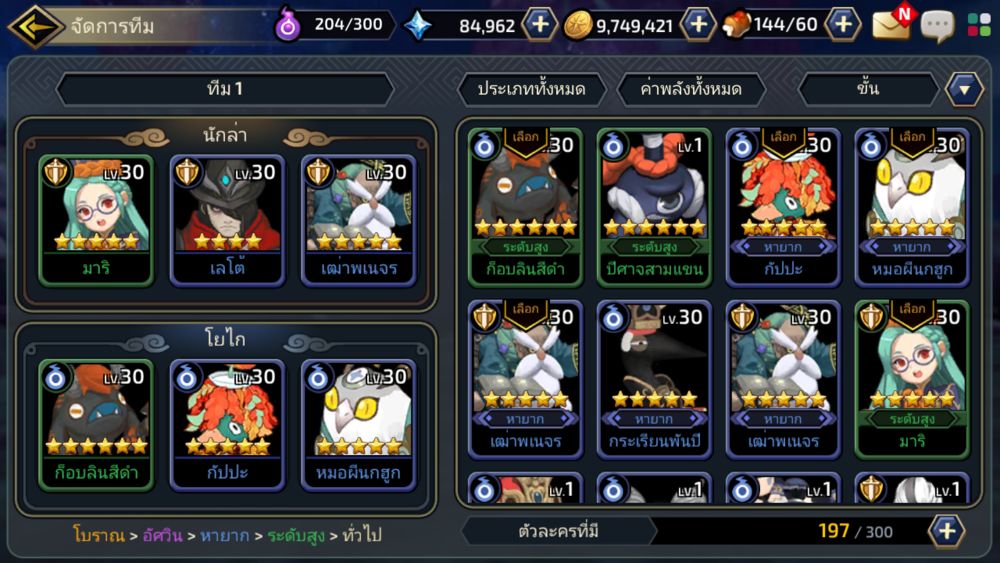 : เป็นการจัดทีมเพื่อนำไปใช้ในการต่อสู้หรือผจญภัยในระบบต่าง ๆ โดยจะมีตัวละครให้ผู้เล่นได้เลือก 2 ประเภทใหญ่ ๆ ได้แก่ นักล่า และโยไก ซึ่งแต่ละประเภทนั้นสามารถเลือกมาเข้าทีมได้ประเภทละ 3 ตัว รวมเป็น 6 ตัว โดยสามารถอัพเลเวลตัวละครได้หลายวิธี ได้แก่ เข้าผจญภัย, นำตัวละครอื่น ๆ มาเป็นวัตถุดิบ,เลื่อนขั้น และข้ามขีดจำกัด นั่นเอง