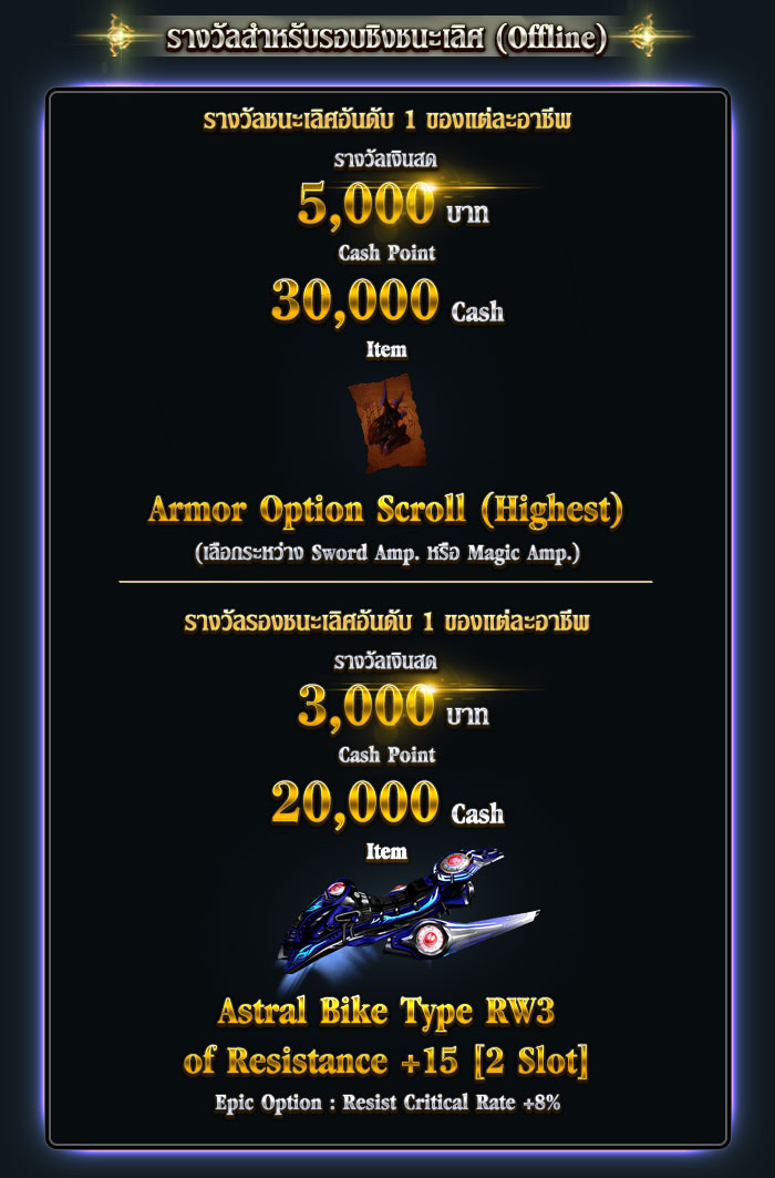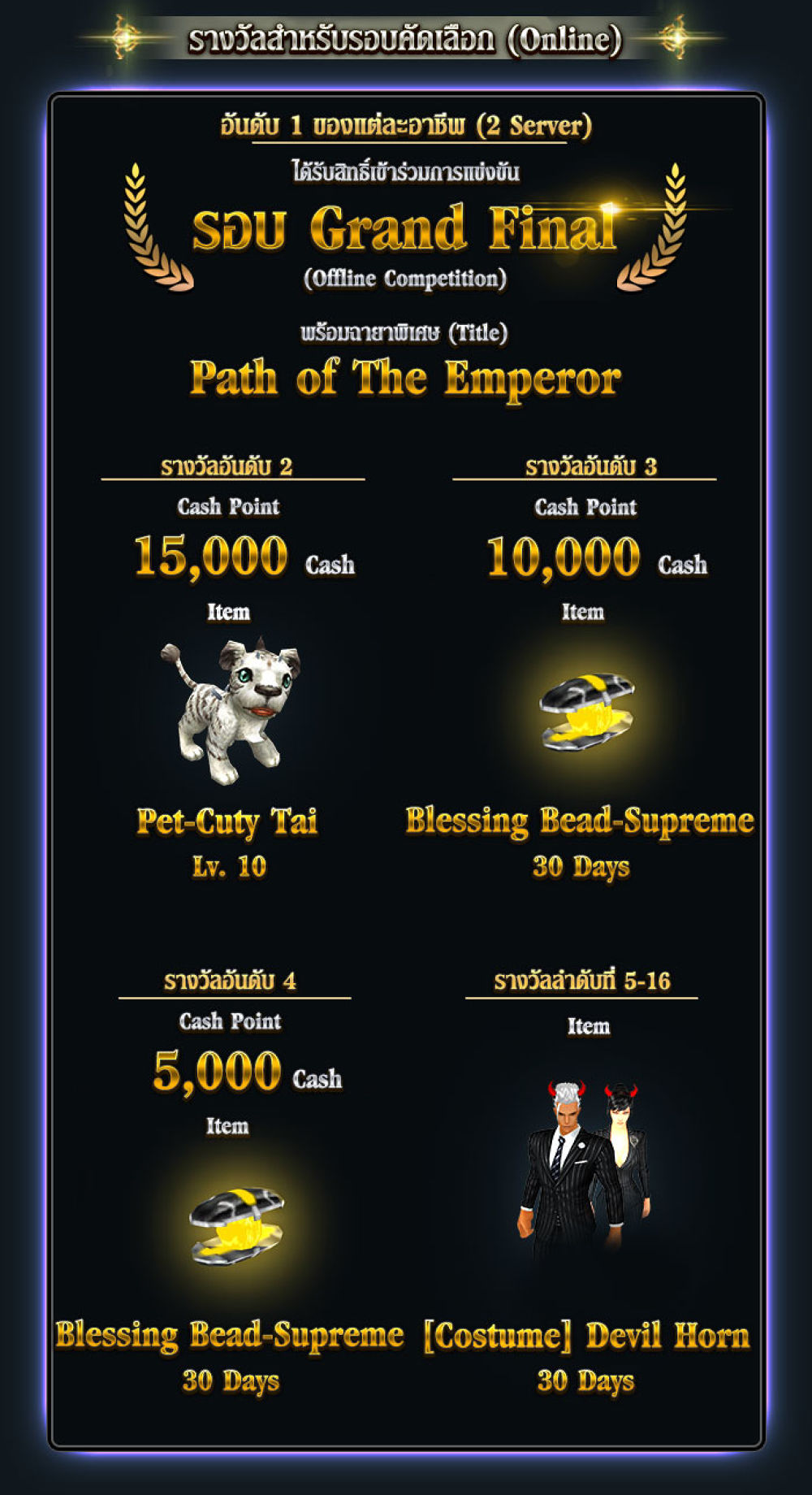 ผู้ที่ได้อันดับ 1 ในแต่ละอาชีพของเซิร์ฟเวอร์ Virgo และ Scorpio (รวม 16 ท่าน) จะได้รับสิทธิ์ในการเข้าแข่งขันรับ Grand Final (Offline Competition) เพื่อเฟ้นหาอันดับ 1 ในแต่ละอาชีพ!!