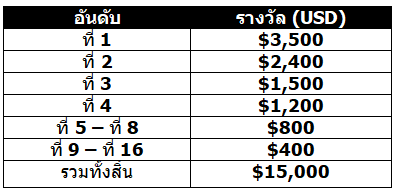 รางวัลรวมมูลค่าถึง $15,000 USD สำหรับผู้เข้ารอบ 16 คน