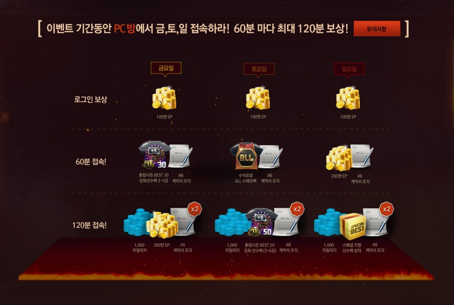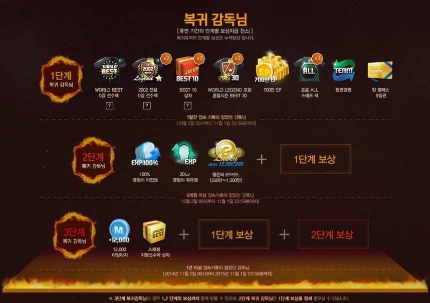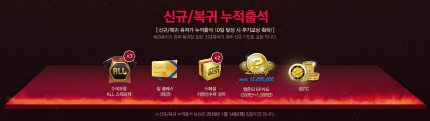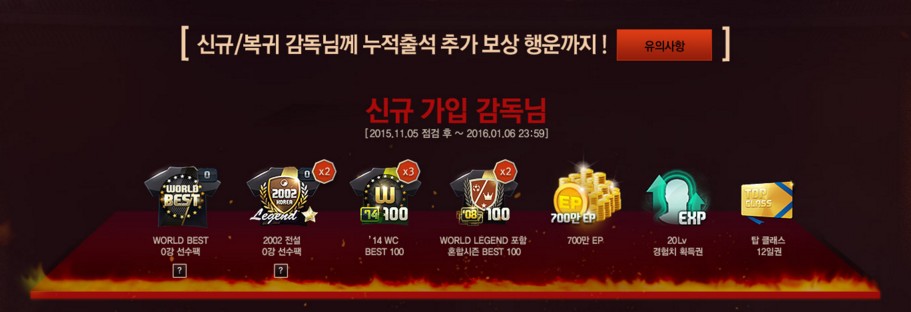 สำหรับผู้เล่นรายใหม่ มีระยะเวลาร่วมกิจกรรมตั้งแต่ 2015.11.05 ~ 2016.01.06 (23.59 น.) โดยจะได้รับรางวัล ดังนี้