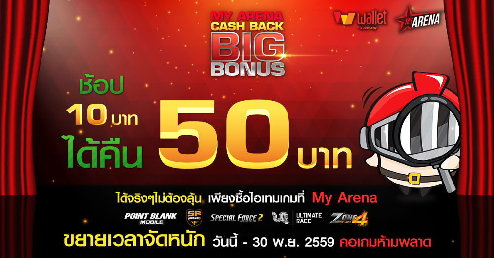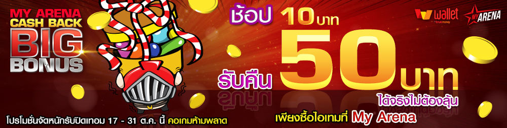 ขยายเวลา!! My Arena Cash Back Big Bonus ซื้อ 10 บาท ได้เงินคืน 50!! อย่าลืมไปใช้กันนะ