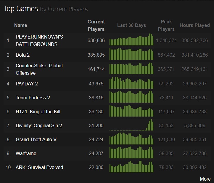 ทุกวันอีกต่างหาก ทางด้านเกมรุ่นพี่อย่าง Dota 2 และ Counter-Strike: Global Offensive ก็ยังคงอยู่อันดับ 2 และ 3 เหมือนเดิม ส่วนเกม PAYDAY 2 และ Team Fortress 2 ก็แย่งชินอันดับที่ 4 กับ 5 อยู่เรื่อยๆ