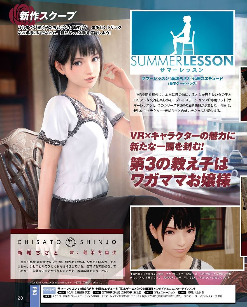 นิสัยโดยรวมของ Chisato Shinjo ก็ตามฉบับลูกคุณหนูคือมีความหยิ่ง ซึ่งทีมผู้พัฒนาเผยว่าเธอมักจะมีคำพูดติดปากประมาณ "ฉันจ้างเธอไว้ก็ต้องสอนให้เต็มที่สิ" เนื้อหาเสริมตัวนี้ยังคงใช้อุปกรณ์ PlayStation VR รวมกับเครื่องเกม PlayStation 4 เหมือนเดิมนะคะ นอกจากนี้ในงาน Tokyo Game Show 2017 ที่จะมีขึ้นในช่วงสัปดาห์หน้าก็จะให้ได้ทดสอบกันภายในบูธ Bandai Namco สำหรับเกม Summer Lesson: Chisato Shinjo Seven Day Etude มีกำหนดวางจำหน่ายเวอร์ชั่นภาษาญี่ปุ่นก่อน โดยจะวางจำหน่ายในวันที่ 10 ตุลาคมที่จะถึงนี้ สนนราคาอยู่ที่ราวๆ 2,980 เยน หรือตีเป็นเงินไทยก็ประมาณ 900 บาท นอกจากนี้ยังมีเวอร์ชั่น Deluxe Pack ที่รวมเนื้อหาเสริม [DLC] เอาไว้ด้วย สนนราคาอยู่ที่ราวๆ 8,320 เยน หรือตีเป็นเงินไทยก็ประมาณ 2,650 บาทค่ะ