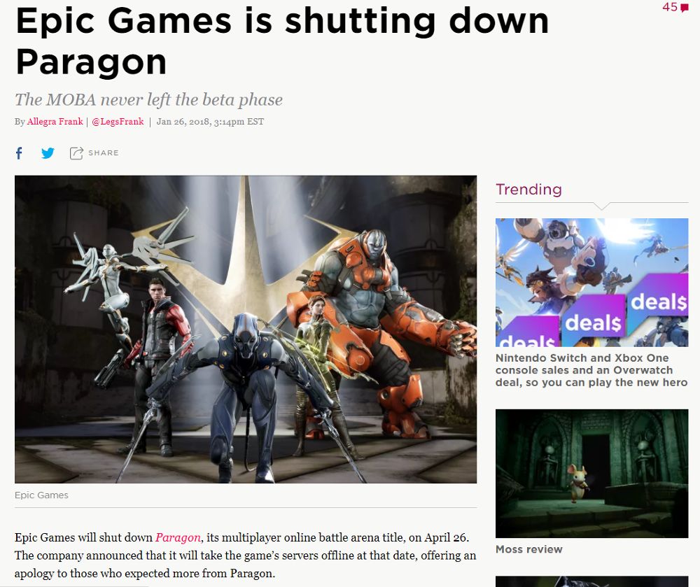 และเมื่อหนึ่งเกมไม่ก้าวหน้า กับอีกเกมที่ดังขึ้นเรื่อยๆ ไม่แปลกใจที่ในที่สุดทีมงานจะต้องปล่อยมือเกมใดสักเกมเพื่อจะได้ทุ่มโฟกัสให้กับสิ่งที่ควรจะโฟกัส ซึ่งในวันที่ผู้เขียนยังเขียนอยู่นี้ Fortnite ยังคงทำกระแสด้านบวกสูงขึ้นไปเรื่อยๆไม่ว่าจะเป็นยอดคนดูถ่ายทอดสด ยอดผู้เล่น ส่วน Paragon นั้นก็ถึงคราวที่จะต้องโบกมือลาเมื่อทาง Epic Games ออกมาประกาศปิดการให้บริการเกม ซึ่งก็ทำเอาแฟนๆใจหายไม่น้อยเพราะอย่างที่ทุกคนบอก คือเกมมันก็สนุกดี แต่ในเมื่อเปิดไปแล้วมันไม่ทำเม็ดเงินให้ผู้พัฒนา สู้ปิดไปแล้วหันมาทุ่มพัฒนาเกมที่ได้รับกระแสตอบรับที่ดีดีกว่า แต่ถึงอย่างไรผู้พัฒนาเขาก็แฟร์พอที่จะประกาศว่า