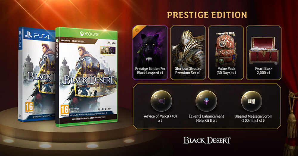 เหล่านักผจญฝั่งคอนโซลเตรียมตัวให้พร้อม เพราะทาง Pearl Abyss ได้ประกาศถึงผู้เล่นว่า Black Desert จะเปิดตัวแพ็คเกจ Prestige Edition แพ็คเกจพิเศษสำหรับเวอร์ชั่นคอนโซล ทีะวางจำหน่ายในวันที่ 6 พฤศจิกายนนี้ ซึ่งจะประกอบไปด้วย ตัเกมและไอเทมพิเศษต่างๆ เช่น เสือดาวดำ, เซตอาวุธ, ชุดชูดาทท์แห่งเกียรติยศ - พรีเมี่ยม และ 2,000 เพิร์ล จากการซื้อแพ็คเกจ Prestige Edition ในครั้งนี้ และในครั้งนี้ท่านยังสามารถพบกับ ‘การ์เดียน’ ซึ่งนับเป็นตัวละครอาชีพที่ 20 การ์เดียนคือตัวละครหญิงสุดแข็งแกร่งที่มีขวานนักรบและโล่เป็นอาวุธคู่กาย เธอจะกวัดแกว่งขวานนักรบในการจัดการกับศัตรูอย่างหนักหน่วง และเพื่อเป็นการฉลองการเปิดตัวการ์เดียน จะมีกิจกรรมพิเศษเช่น รางวัลเช็คชื่อเข้าเกมรอบพิเศษ และกิจกรรมอัพเลเวลการ์เดียน ที่จะจัดไปจนถึงวันที่ 2 ธันวาคมนี้ ความน่าตื่นเต้นยังไม่หมดเพียงเท่านี้ เพราะท่านยังสามารถสืบทอดพลังรัน, สไตรเกอร์ และนินจาได้อีกด้วย