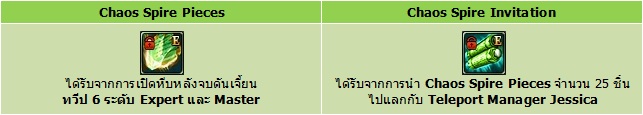Chaos Spire Invitation ได้มาจากการนำ Chaos Spire Pieces จำนวน 25 ชิ้น ไปแลกกับ Teleport Manager Jessica