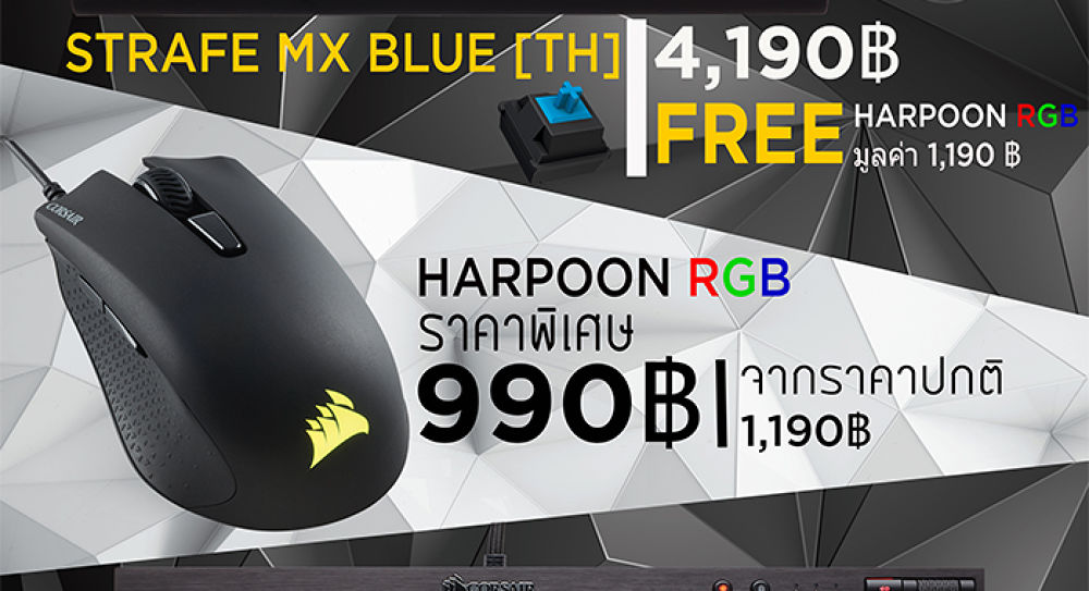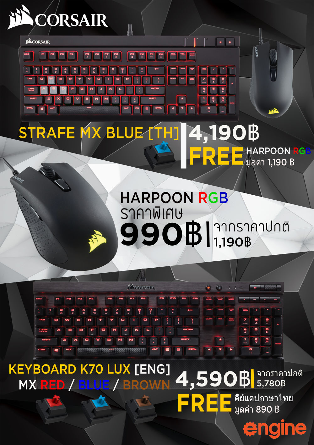 1. Corsair Keyboard Strafe Cherry MX blue ภาษาไทย ราคา 4,190 บาท แถมฟรี!! Mouse Harpoon RGB มูลค่า 1,190 บาทฟรี