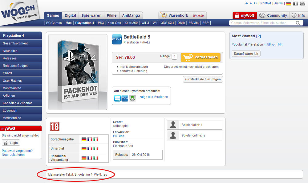จำกันได้หรือเปล่าที่ก่อนหน้านี้มีข่าวลือหลุดออกมาว่าทาง DICE กำลังพัฒนาภาคใหม่ของซีรี่ย์ FPS สุดมันส์ภายใต้ชื่อ "Battlefield 5: Armageddon" ( ชื่อไม่เป็นทางการ ) ซึ่งจะวางจำหน่ายช่วงไตรมาสที่ 4 ของปีนี้ ล่าสุดมีคนไปพบชื่อเกม Battlefield 5 บนเว็บไซค์จำหน่ายเกมของประเทศสวิตเซอร์แลนด์ แต่ไม่ได้มีชื่อ Armageddon ลงท้ายแถมเขียนรายละเอียดเอาไว้ว่าตัวเกมเป็นแนว FPS ที่ผสมผสานรูปแบบการวางแผนเอาไว้ มีโหมดออนไลน์ [Multiplayer] ให้ได้เล่น นอกจากนี้ยังเขียนรายละเอียดเอาไว้ว่าเนื้อหาภายในเกมจะย้อนไปยุคสงครามโลกครั้งที่ 1 อีกครั้ง ( O_o!? ) และมีกำหนดวางจำหน่ายในวันที่ 25 ตุลาคมนี้บนเวอร์ชั่น PC, PlayStation 4 และ Xbox One ทั้งนี้ข้อมูลดังกล่าวยังเป็นข่าวลือให้เกมเมอร์ได้ลุ้นกันเร็วๆ ก็คงต้องรอทาง Electronic Arts [EA] และ DICE ประการอย่างเป็นทางการ คาดว่าในงานเกมสุดยิ่งใหญ่ E3 2016 เราอาจจะได้ยินข่าวดีก็เป็นได้