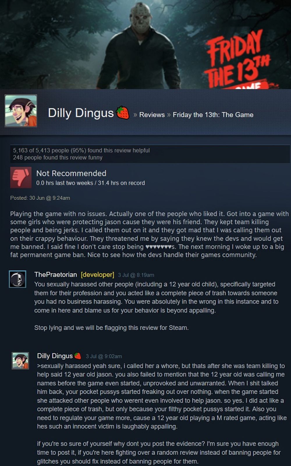 สุดท้ายแล้วพ่อหนุ่ม Dilly ก็ไม่สามารถอดทนได้ไหวจนได้ต่อว่าไปยังเด็กผู้หญิงและผู้ชายคู่นั้นด้วยคำพูดที่แรงพอสมควรเลย แต่สุดท้ายก็เจอคำพูดสวนกลับมาว่า "อะไรของมรึงฟระ!!! รู้ไหมว่าฉันน่ะรู้จักทีมผู้พัฒนาเกมนี้นะเฟ้ย เดี๋ยวฉันไปฟ้องเขาขึ้นมาแล้วแกจะอดเล่นเกมนี้นะ" เมื่อได้ยินแบบนั้น Dilly ก็ตอบกลับไปว่าเขาไม่สนใจหรอก ( I Don't Care!!! ) สุดท้ายแล้ววันต่อมาเขาก็ถูกแบนตัวเกมอย่างถาวร ทำให้ในการโพสรีวิวให้คะแนนเกม Friday the 13th: The Game ในด้านลบนั้นเอง