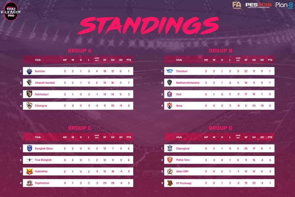 ในการแข่งขันรายการ Thai E league Pro นี้ยังคงความเข้มข้นขึ้นเรื่อยๆทุกขณะโดยแต่ละสโมสรก็พยายามวางแผนจัดกลยุทธ์งัดไม้เด็ดออกมาเพื่อหวังพิชิตคู่แข่งเก็บคะแนนในการแข่งขันแต่ละรอบเพื่อให้สโมสรตนเองสามารถเข้ารอบไปสู่รอบต่อไปได้ในช่วงที่ผ่านมาแต่ละสโมสรเองก็ได้มีโอกาสเจอกันทุกทีมในกลุ่มเดียวกันไปและเริ่มมีคะแนนเก็บสะสมกันไปบ้างแล้วแต่ความเข้มข้นจะยิ่งเพิ่มขึ้นมากหลังจากนี้เพราะแต่ละสโมสรจะต้องเจอกันอีกครั้งตั้งแต่สัปดาห์นี้เป็นต้นไปเชื่อว่างานนี้แต่ละสโมสรเองก็คงได้เตรียมแผนสำหรับรับมือคู่แข่งในการเจอกันรอบที่สองนี้อย่างแน่นอนลองมาดูผลงานของแต่ละกลุ่มสโมสรกันดีกว่าครับว่าตอนนี้สโมสรไหนได้ไปคนละกี่คะแนนกันบ้างแล้ว