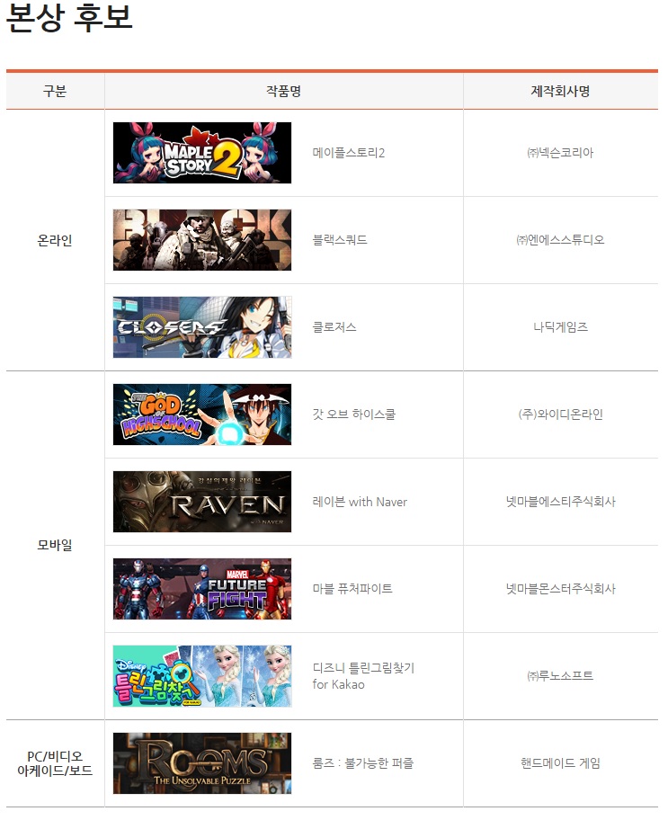 ส่งเข้าประกวาด โดยทั้ง 3 เกมได้เสนอชื่อเพื่อเข้าชิงรางวัล Korea Game Awards 2015