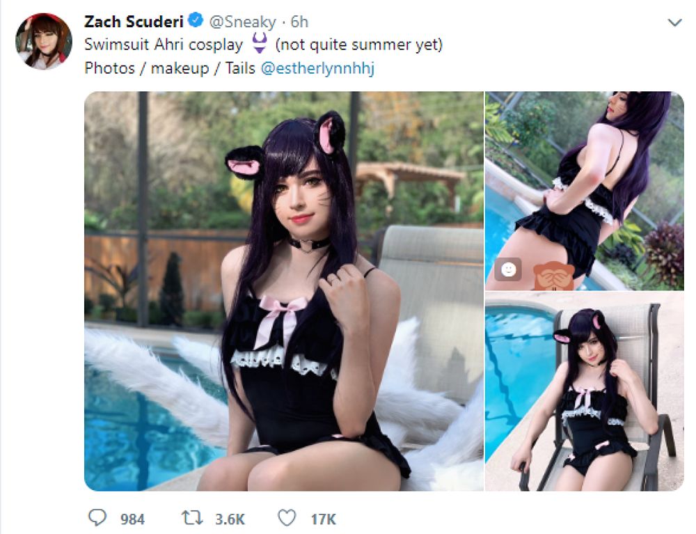 เพิ่งผ่านช่วงปีใหม่รับอากาศหนาวกันได้ไม่นานก็ต้องมาเจออะไรที่ร้อนแรงแบบนี้อีกแล้ว!! เมื่อ Zachary “Sneaky” Scuderi มือดีจากเกม League of Legends ผู้เล่นหลักทีม Cloud 9 ออกมาปล่อยภาพ Cosplay ใหม่ล่าสุดที่เหล่าแฟนเกมเห็นแล้วต้องร้องว๊าว!!กับชุด Swimsuit ของตัวละคร Ahri ในเกม League of Legends ที่ต้องบอกว่ายิ่งนับวันแกยิ่งแต่งเหมือนผู้หญิงเข้าไปทุกทีหลังจากที่แฟนสาวของเขาพยายามช่วยเหลือเขาอย่างเต็มที่