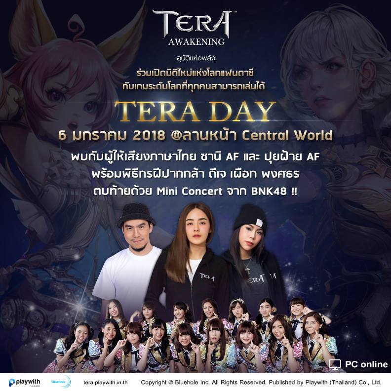 ในเมื่อเกมระดับโลกมาเยือนถึงถิ่นไทยจะขาดงานเปิดตัวเกมอย่างเป็นทางการไปได้อย่างไรกัน และนี่คืองาน TERA DAY ที่จะจัดขึ้นในวันที่ 6 มกราคม 2018 ณ ลาน Central World เพื่อนๆ จะได้มาสัมผัสกับกิจกรรมมากมายภายในงาน พร้อมกับพบปะทีมงานการแถลงข่าวเปิดตัวเกมอย่างเป็นทางการ การแข่งขัน และได้พบกับแขกรับเชิญสุดพิเศษได้แก่ คุณ ซานิ AF (นิภาภรณ์ ฐิติธนการ) คุณ ปุยฝ้าย AF (ณัฎฐพัชร์ วิภัทรเดชตระกูล) และ นักพากย์มืออาชีพกว่า 20 ชีวิตผู้ให้เสียงภาษาไทยภายในเกม TERA Online ประเทศไทย ไม่เพียงเท่านั้น ผู้รับหน้าที่พิธีกรจะเป็นใครอื่นไม่ได้ผู้มีสมยานาม DJ ฝีปากกล้า คุณ เผือก (พงศธร จงวิลาส) และตบท้ายด้วย Mini Concert จาก สาวๆ BNK48 ที่จะมาเขย่าเวที TERA ให้สั่นสะเทือน!