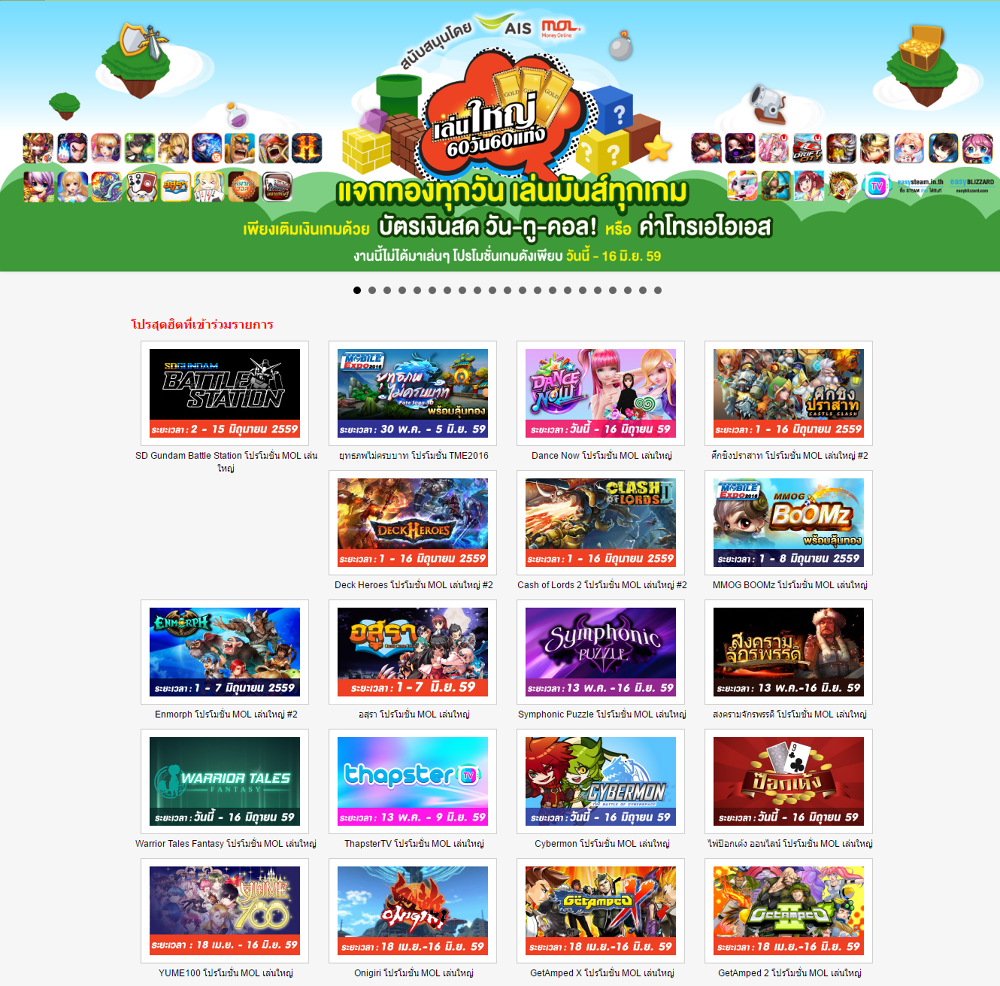 ค่ายเกมดังจึงจัดโปรดีมาส่งท้ายสำหรับเดือนมิถุนายนนี้ โดยเกมที่จัดโปรเด็ดๆ มาให้อย่างต่อเนื่องประกอบไปด้วยเกม เก้าเก, มหาศึก 3 ก๊ก, ยุทธภพไม่ครบบาท, สงครามจักรพรรดิ, เทพมารสะท้านยุทธ, อสุรา, SD Gundam Battle Station, AU MobileTH, Fantasy Online, M Star, Dance Now, Clash of Lord 2, Boomz mobile, Thapster TV, Age of Avatar (AOA), Symphonic Puzzle, YUME100 , Castle Clash , Enmorph , Onigiri, GetAmped X, GetAmped 2, RAN Online, XAOC, King of Triwars, ELOA โดยสามารถติดตามรายละเอียดโปรโมชั่นของแต่ละเกมเพิ่มเติมได้ที่