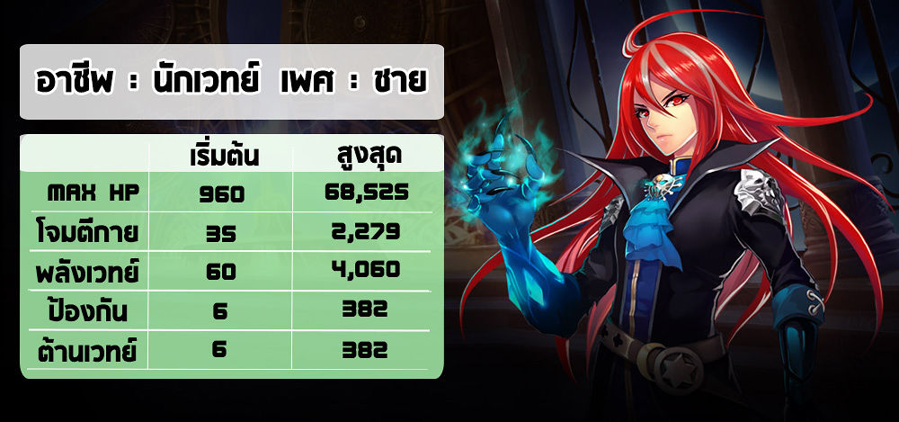 นักเวทย์ : อาชีพสายเวทย์โจมตี ที่สามารถสร้างสถานะผิดปกติแก่ศัตรูได้เป็นอย่างดี อาทิ เผาไหม้, มึนงง