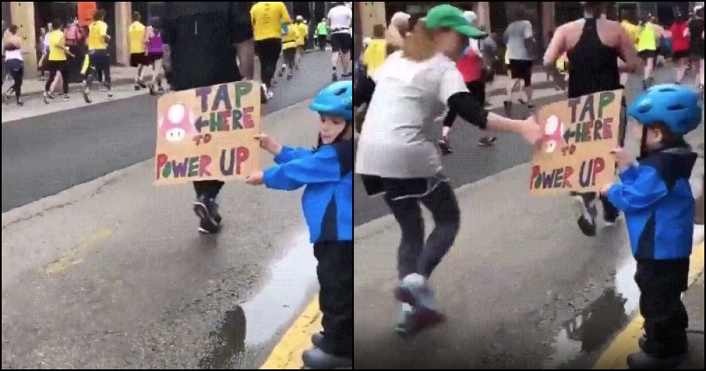สำหรับเจ้าหนูน้อยคนดังกล่าวนี้ ก็ได้กำลังถือป้ายที่มีรูปของเห็ดจากซีรี่ย์เกม Mario และเขียนเอาไว้ว่า "มาแตะที่เจ้าเห็ดนี่สิ เพื่อที่จะได้รับพลังมากขึ้น" ซึ่งก็เป็นการสื่อถึงเห็ดภายในเกม Mario ที่เมื่อมาริโอ้ได้กินเข้าไปแล้วจะทำให้แข็งแกร่ง และตัวใหญ่ขึ้นทันทีนั่นเอง ก่อนที่ภายในคลิปจะแสดงให้เห็นว่ามีเหล่านักวิ่งหลายคนได้มาแตะที่เจ้าเห็ดของป้ายกันอย่างอบอุ่นด้วย! เรียกได้ว่าเป็นอะไรที่ดูสร้างสรรค์มากเลยจริงๆ ขณะที่ช่วงท้ายคลิปก็ได้แสดงให้เห็นว่าเด็กคนนั้นดูมีความสุขมากๆ เลยอีกต่างหาก