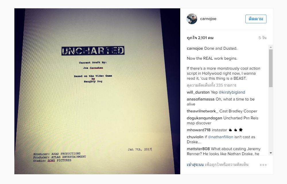 กลับมาที่เนื้อหาข่าวที่อาเจ๊นัทจะนำเสนอต่อไปนี้กันหน่อย เป็นข่าวเกี่ยวกับภาพยนตร์ที่มีแผนนำเกมแอ็คชั่นสุดมันส์อย่าง "Uncharted" เตรียมมาสร้างขึ้นบนจอเงิน ก่อนหน้านี้มีข่าวมากมายออกมา ไม่ว่าจะเป็นปัญหาเรื่องบทภาพยนตร์, ปัญหาเรื่องหาผู้กำกับไม่ได้ หรือ แม้แต่การเลือกนักแสดงนำของเรื่อง เป็นต้น ล่าสุดคุณ Joe Carnahan ผู้ที่ได้รับการเขียนบทภาพยนตร์เรื่องนี้ได้โพสภาพบน Instagram ของตนเองว่า "ตอนนี้บทภาพยนตร์เรื่อง Uncharted ได้เขียนเสร็จเป็นที่เรียบร้อยแล้ว" พร้อมคุยกับว่า "มันคือบทภาพยนตร์แนวแอ็คชั่นที่สุดยอดที่สุดเท่าที่ Hollywood เคยมี เพราะบทมันดีจริงๆ"