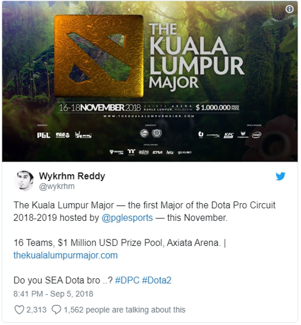 ถือว่าไฟแห่งการแข่งขันในฤดูกาบใหม่จะได้เริ่มต้นอย่างเป็นทางการอีกครั้งหลังจากที่รายการชิงแชมป์โลกอย่าง The International 8 ในการคว้าแชมป์โลไปครองของทีม OG ได้ปิดฉากลงไปเมื่อไม่นานมานี้ ก็มาสารต่อด้วยการเปิดฤดูกาลใหม่ด้วย PGL’s Kuala Lumpur Major ที่จะเป็นรายการแีกประเดิมการเก็บคะแนน Dota 2 Pro Circuit (DPC) season 2018-2019 โดยมีเงินรางวัลให้ชิงกันถึง $1 ล้านเหรียญ เตรียมจัดขึ้นที่สนาม Axiata Arena ที่ประเทศมาเลเซียในวันที่ 9 พฤศจิกายน 2018