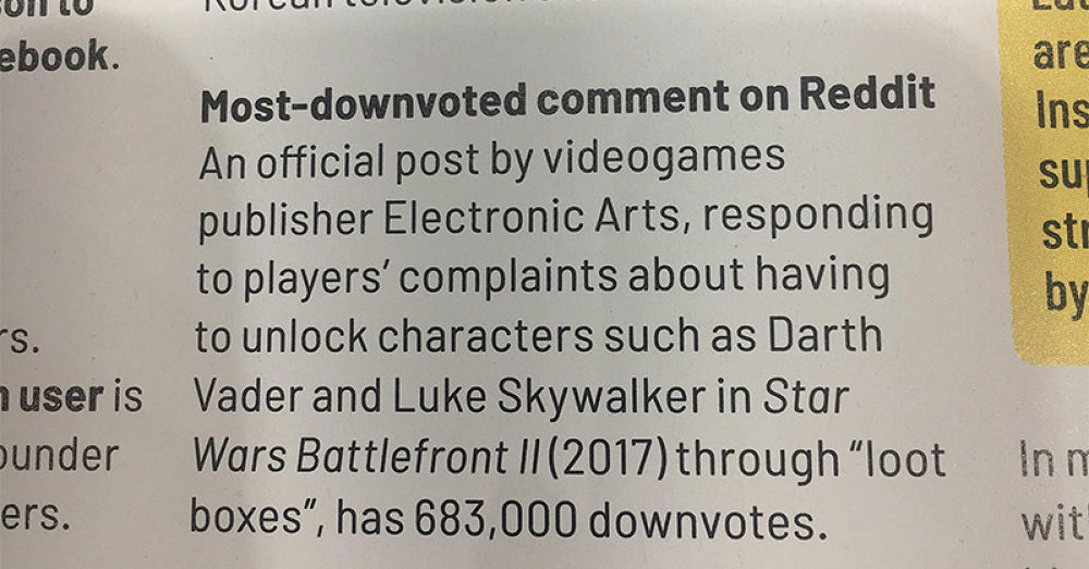 อยู่ด้วย โดยมีเนื้อหาใจความประมาณว่าการตอบคำถามของทาง EA เกี่ยวกับการปลดล็อกตัวละคร Darth Vader และ Luke Skywalker ได้ตอบกลับเหล่าเกมเมอร์ไปว่าจำเป็นต้องไขออกมาจากระบบ Loot Boxes เท่านั้น