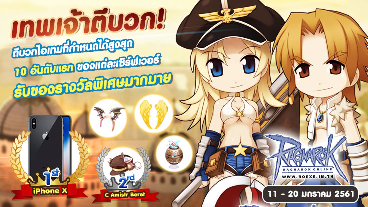 สำหรับผู้ที่ตีบวกไอเท็มได้มากที่สุดเป็นอันดับ 1 ของแต่ละเซริ์ฟเวอร์(Thor, Loki, Valkyrie) iPhone X 64 GB สี Space Gray 1 เครื่อง มูลค่า 40,500 บาท! รวม 3 รางวัล