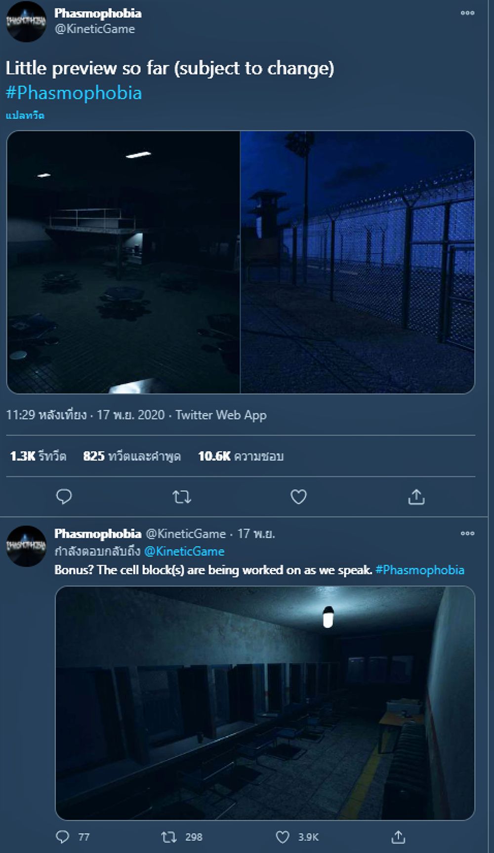 Phasmophobia เกมออนไลน์ชื่อดัง Coop 4 คน ที่ให้ผู้เล่นไปทำภารกิจตามหาผีในสถานที่ต่างๆ เพื่อดูว่าผีนั้นจะจัดอยู่ในชนิดไหน และในบางครั้งก็อาจต้องถ่ายรูปให้ติดผี หรือให้เขาแสดงอิทธิฤทธิ์ โดยผู้เล่นก็อาจจะไปทำให้ผีโกรธจนโดนหักตายทีละคนก็เป็นได้ ซึ่งเกมก็ได้เปิดให้ไปเล่นกับเพื่อนๆ แล้วเมื่อวันที่ 19 กันยายน 2020 แต่ล่าสุดนี้ ทางผู้สร้างก็ได้เผย 3 ภาพตัวอย่างของด่านใหม่ในชื่อ "Prison" หรือ "เรือนจำ" ที่จะอัปเดตเข้าสู่เกมเร็วๆ นี้บน Twitter มาให้ชมกันเป็นที่เรียบร้อยแล้ว! สามารถเข้าไปชมรูปภาพเต็มๆ ได้ที่ลิงก์นี้เลย