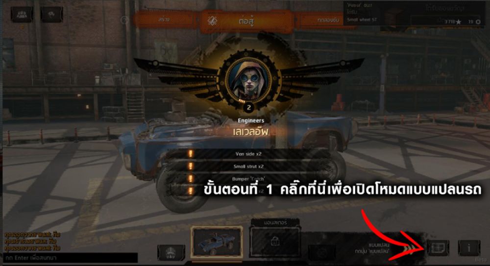4. เมื่อผู้เล่นมีเลเวลเพิ่มขึ้นตั้งแต่ 2 - 10 จะได้รับแบบแปลนรถเพิ่มเติมอีกถึง 9 คัน ( เลเวลละ 1 คัน ) โดยสามารถโหลดแบบแปลนอื่นๆมาใช้ได้ด้วยการทำตามขั้นตอน ดังภาพ *หมายเหตุ : เมื่อเลเวลอัพจะปลดล็อคโครงสร้างส่วนต่างๆของรถ ยิ่งมีเลเวลสูงยิ่งปลดล็อคเยอะ และทำให้สามารถประกอบรถได้หลากหลายแบบ