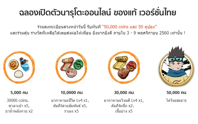 4. ภารกิจ Lucky Draw ลุ้นรับโชค ผู้เล่นที่ผ่านภารกิจ 2 ใน 3 อย่าง จะได้รับใบ Lucky Draw ลุ้นรับโชครางวัลใหญ่ ฟิกเกอร์โมเดล Zero Naruto Kizuna Relation และ Manga Dimensions MSP Naruto (Overseas Limited) ลิขสิทธิ์แท้ ทุกวันตลอดงาน เพื่อนๆ เหล่านินจา สามารถเริ่มลงทะเบียนล่วงหน้าได้ผ่าน www.narutoonline.in.th ตั้งแต่วันที่ 3 พฤศจิกายน เวลา 12.00 น.