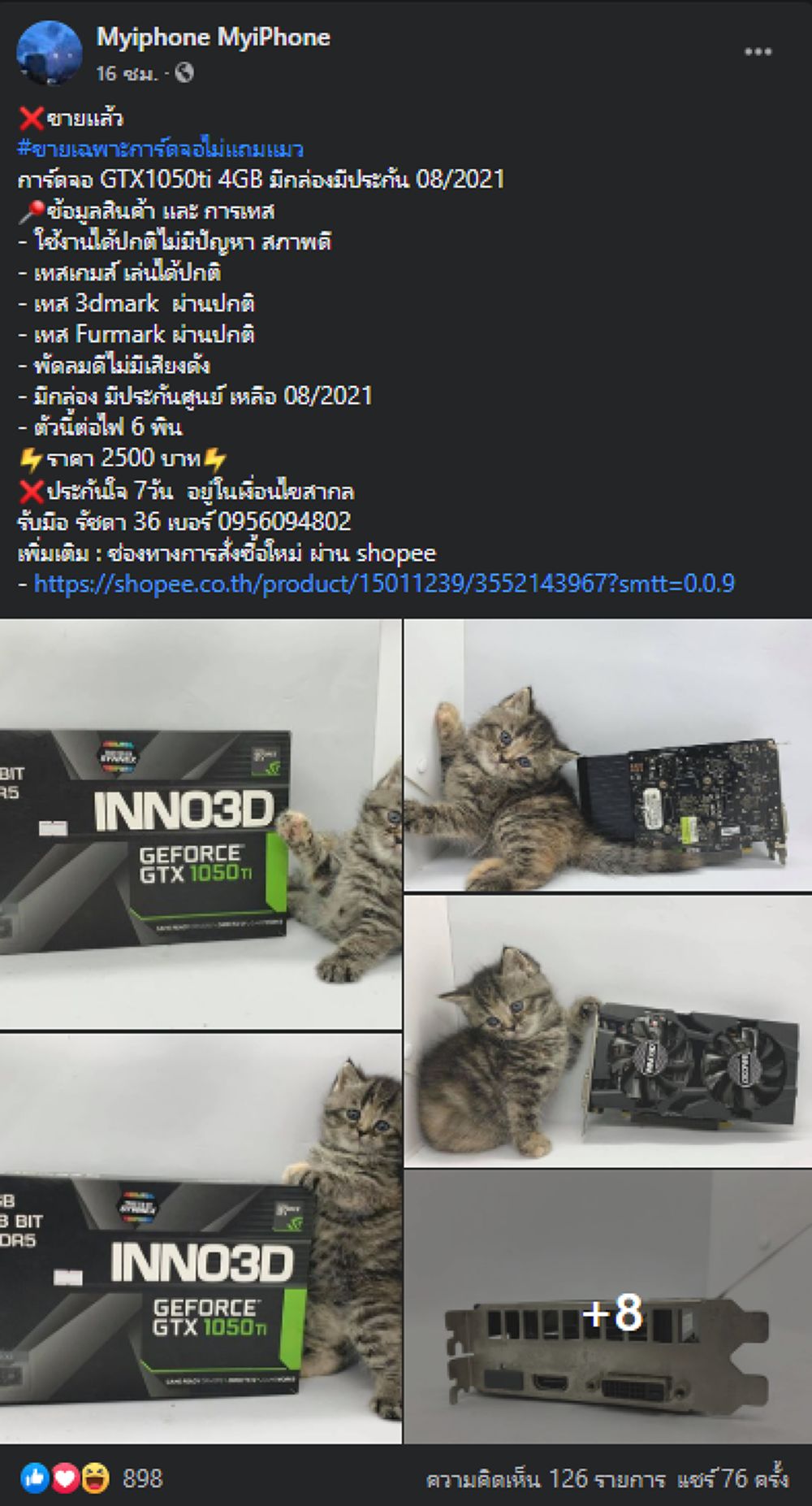 ทำการโพสต์ขายการ์ดจอรุ่น GTX1050ti 4GB มือ 2 โดยมีสภาพที่ยังสามารถใช้งานได้ปกติดี แต่โพสต์ดังกล่าวนั้นก็เป็นที่สนใจของชาวไทยหลายคนยันนอกกลุ่มอย่างมาก และยังทำให้คุณ