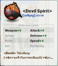 ***ไอเทม Devil Medal (Devil Spirit) เป็นเหรียญพิเศษ ที่หาได้จากแพ็คเกจ +10 Devil Perfect Pack เท่านั้น ! และยังเป็นเหรียญที่ใส่ได้เฉพาะตัวละคร Devil ซึ่งบวกความสามารถ ดังนี้