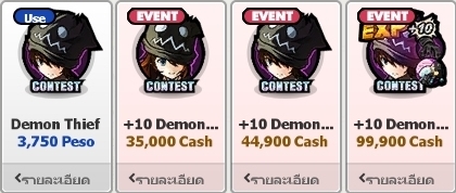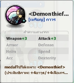 ***ไอเทม Demon Thief Medal (Demon Thief แสนประหลาด) เป็นเหรียญพิเศษ ที่หาได้จากแพ็คเกจ +10 Demon Thief Perfect Pack เท่านั้น ! และยังเป็นเหรียญที่ใส่ได้เฉพาะตัวละคร Demon Thief ซึ่งบวกความสามารถ ดังนี้
